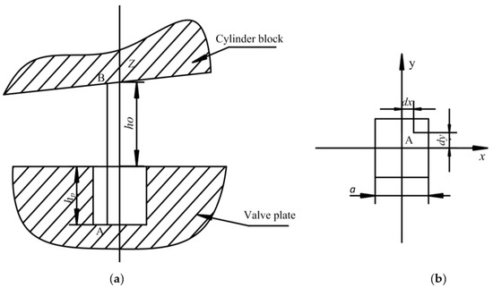 Figure 3 shows the geometry of a micro-square texture element relative to the surface of valve plate. In this figure, hp is the distance from the bottom center of micro-square to the surface of valve plate, a is the side length of micro-square, and dx and dy are the local coordinates of the micro-square. Therefore, the oil film thickness equation formed by a micro-square and a tilted cylinder block is: