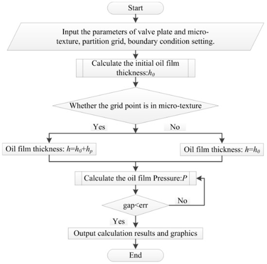 Figure 4 shows the flow chart for calculating the oil film thickness and pressure of valve plate with microtexture. When solving for the oil film thickness and pressure of a microtexture element on a valve plate, we must first determine the parameters of the valve plate and microtexture, then divide the valve plate’s model into meshes. We solved the Reynolds equation using the finite difference method, after setting boundary conditions. Two cases should be considered when calculating the oil film thickness of microtextures: one is when the mesh point is in the microtexture; the other case is when the mesh point is not in the microtexture.