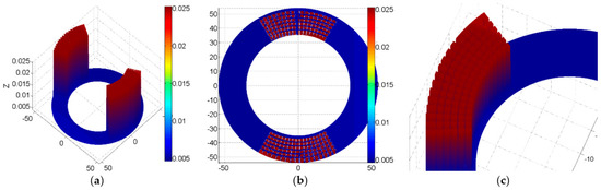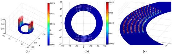 Figure 7 shows the oil film thickness distribution of the valve plate with micro-hemispherical texture. Figure 7a is the three-dimensional distribution graph of the oil film thickness, Figure 7b is the two-dimensional distribution graph and Figure 7c is a local magnification graph of 7a.