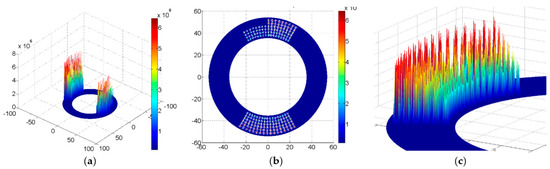 Figure 8 shows the oil film pressure distribution of a valve plate with micro-hemispherical texture. The local high pressure was produced by machining the micro-hemispherical texture. Figure 8a is the three-dimensional distribution graph, Figure 8b is the two-dimensional distribution graph and Figure 8c is a locally magnified view of 8a. The micro-hemispherical texture was arranged on the surface of the valve plate.