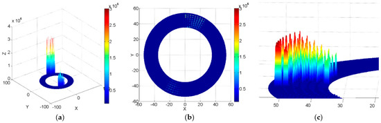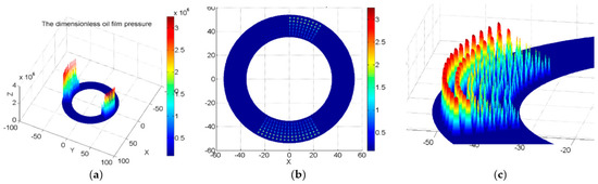 Figure 10 shows the distribution of oil film pressure for the valve plate with micro-cylindrical texturing. Figure 10a is the three-dimensional distribution graph; Figure 10b is the two-dimensional distribution graph; and Figure 10c is a locally magnified view of Figure 10a.