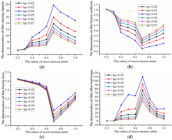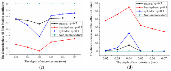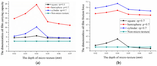 - The dimensionless oil film friction coefficient was 0.2571, 0.4821 and 0.6848 when the radius (half-side length) was 0.7 mm and the depth was 0.04 mm for the micro-hemispherical texture, micro-cylindrical texture, and micro-square texture respectively. At this point, the friction coefficient reached a minimum.
