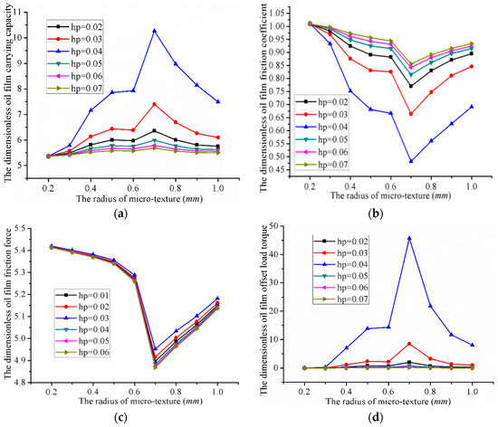 Influence of the micro-cylindrical texture radius on the performance of valve plate: (a) The carrying capacity; (b) the friction coefficient; (c) The friction force; and (d) The offset load torque.