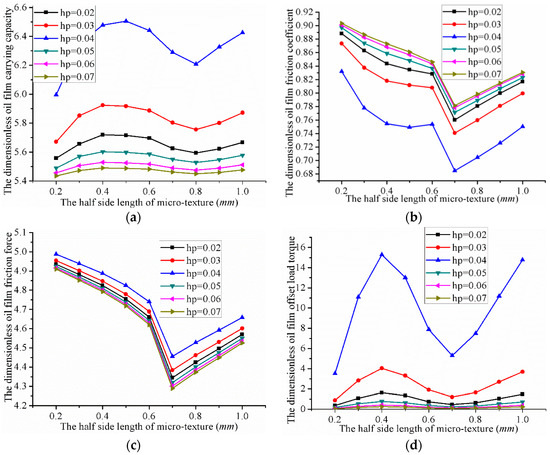 For a fixed microtexture radius, an increase in depth tends to lead to an initial increase then decrease in the dimensionless oil film carrying capacity, friction force, and offset load torque. The oil film friction coefficient has the tendency to decrease first and then increase. Furthermore, at a fixed microtexture depth, an increase in the microtexture radius or side length leads to the dimensionless oil film carrying capacity, friction force, and offset load torque first increasing first then decreasing. The oil film friction coefficient tends to decrease first and then to increase. This indicated that the optimal oil film lubrication characteristics could be obtained by optimizing micro-hemispherical texture depth.