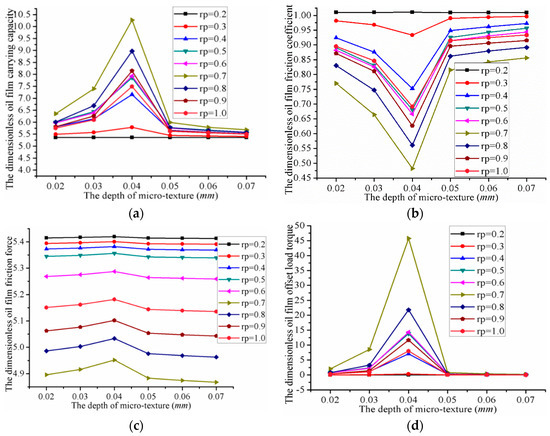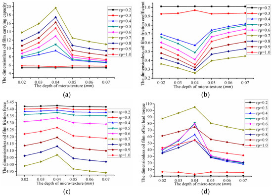 Influence of micro-hemispherical texture’s depth on the performance of the valve plate: (a) The carrying capacity; (b) The friction coefficient; (c) The friction force; and (d) The offset load torque.