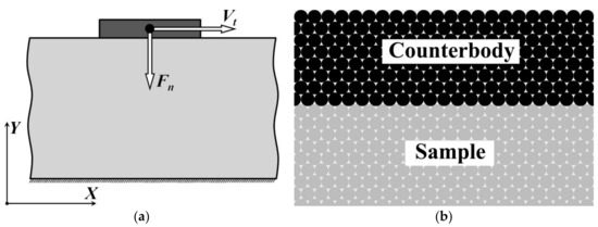 The sample was loaded in two stages. In the first stage, a normal load was applied to the automata imitating the surface of the counterbody. During this stage, the value of normal load gradually increased until it reached the assigned value of contact pressure σn (contact pressure is determined as the ratio of applied normal load Fn to the area of the counterbody surface). At the end of the relaxation phase, the system established a stationary force balance. After that (at the second stage), the surface automata of the counterbody were subject to the tangential motion by applying constant tangential velocity Vt and zero normal velocity (along the Y axis).