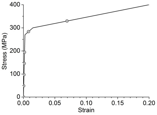 The following “basic” mechanical characteristics were assigned to movable cellular automata modelling the surface layer of the model material: density ρ = 4500 kg/m3, Young’s modulus E = 110 GPa, Poisson’s ratio ν = 0.33, yield strength σyield = 270 MPa. The uniaxial loading diagram of the model material of the movable automaton is shown in Figure 2 (this diagram is used as the unified stress-strain curve for the implemented model of the plastic flow). The mentioned mechanical characteristics are close to the corresponding mechanical parameters of coarse-grained VT1-0 titanium [44].