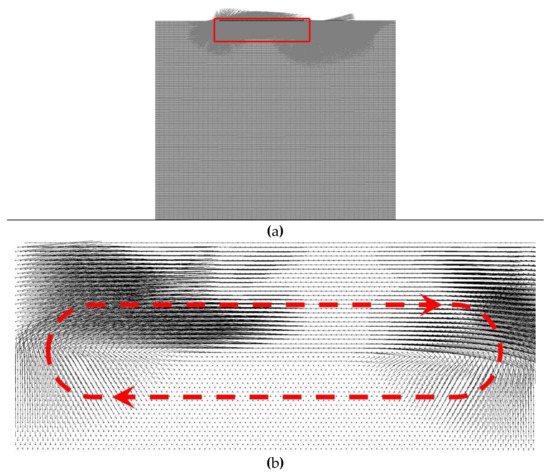 A typical example of the field of the velocity in the model sample at the beginning phase of the tangential motion of the counterbody. The red rectangle in (a) outlines the surface region of the sample, whose enlarged view is shown in (b).