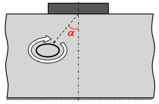 Schematic representation of the propagation of an elastic vortex toward the interior of the sample. The dotted line shows the axis of the normal to the contact surface. The angle of inclination of the vortex propagation trajectory is determined with respect to this axis.