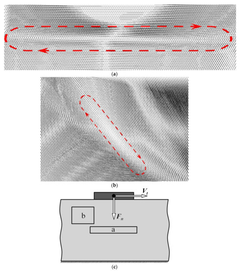 The contact interaction of dry surface layers of solid bodies is a complex multiscale phenomenon, simultaneously taking place at various spatial scales from atomic to macroscopic [1,2,3,4]. Understanding the processes in the surface layers under the contact spots is key to the prediction and control of the behavior of surface layers during friction, indentation, burnishing, and so on [5,6,7,8,9,10,11,12]. In spite of pronounced differences in the mechanical behavior of surface layers with different internal structures and rheological properties under contact interaction, some fundamental dynamic phenomena are common for various solids and take place at various spatial scales. Among them, we should emphasize a considerable increase of the contribution of the collective rotational (vortex-like) mode to material deformation [13,14,15,16,17]. Collective vortex motions arise near the external and internal boundaries in the material under dynamic loading with a significant lateral (with respect to the plane of the boundary) component. Such conditions are realized, in particular, in the surface regions under conditions of the dynamic contact interaction of solids. In the case of ductile materials, dynamic contact interaction with a significant tangential component can lead to a shear instability of the surface layers and a transition from the laminar to the turbulent regime of deformation accompanied by structural transformations, up to the formation of amorphous regions and nanofragmentation [7,16,18,19,20]. The results of theoretical studies and experimental data show that the contribution of the rotational modes of deformation to the response of the material becomes highly significant under conditions of dynamic loading or dynamic variation of the local stress state [21,22,23,24].