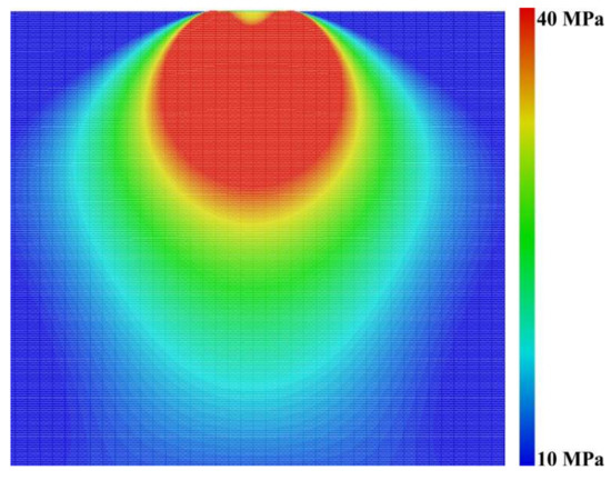 It is necessary to note that as a result of applying initial contact pressure, a static stress state is formed characterized by axis symmetry (Figure 6). During tangential displacement of the counterbody, an elastic disturbance is propagating from the contact surface deep into the material. The dynamic elastic vortex propagates on the disturbance front and leads to considerable distortion of the stress field. Figure 7 shows that after passing the vortex, the stress field becomes non-symmetric. In particular, the distribution of the shear stress is characterized by a significant distortion: in the front of the disturbance, the so-called “tongue“ is formed, which is connected to the elastic vortex propagating into the bulk of the material. Note that no such local dynamic structure is observed in dynamic normal contact loading [29].