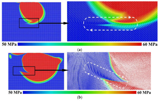 The elastic vortex propagates deep into the sample at some angle α to the surface normal (Figure 4) with a velocity equal to the shear wave speed VS (for the material under consideration, VS ≈ 3000 m/s). The simulation results show that direction of the vortex motion (defined by the angle α) and the ratio of its principal axes depend on the counterbody velocity and contact pressure. Figure 5 shows examples of the vortices initiated at contact pressure σn ≈ 0.36σyield and different velocities Vt. At small loading velocities (Vt = 1.5 m/s, Figure 5a), the elastic vortex propagates deep into the material almost vertically (α ≈ 0°) and has an elongated (“flat”) shape. The dimension of such a vortex along the horizontal axis, which is parallel to the contact surface, approximately equals the contact patch size. At the same time, at higher velocities of the contact loading (Vt = 15 m/s, Figure 5b), the vortex propagation direction is deflected from the sample symmetry axis to the direction opposite the counterbody velocity. Such vortices form near the contact patch edge. Their size is several times smaller than the contact patch size, and the shape is close to the “classical” circular structure [31,35].