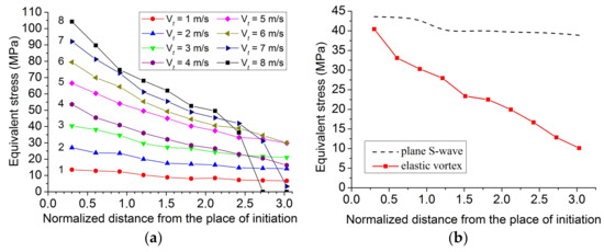 The decrease in the values of equivalent stress in the central part of the elastic vortices during their propagation toward the bulk of the material: (a) elastic vortices initiated at different values of tangential velocity Vt of displacement of the counterbody; (b) the elastic vortex initiated at Vt = 3 m/s (red curve) and the plane shear wave initiated by tangential displacement of the free surface at Vt = 3 m/s (black curve). All data correspond to the same value of contact pressure σn = 0.54σyield.