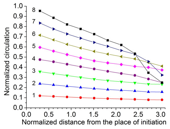 The decrease in the values of circulation in the central part of the elastic vortices during their propagation toward the bulk of the material. The shown curves were obtained for the vortices initiated at different values of the tangential velocity of displacement of the counterbody: 1, Vt = 1 m/s; 2, Vt = 2 m/s; 3, Vt = 3 m/s; 4, Vt = 4 m/s; 5, Vt = 5 m/s; 6, Vt = 6 m/s; 7, Vt = 7 m/s; 8, Vt = 8 m/s. Circulations are plotted in dimensionless units obtained by dividing the absolute values by the initial value of circulation for the vortex initiated at Vt =8 m/s. All data correspond to σn = 0.54σyield.