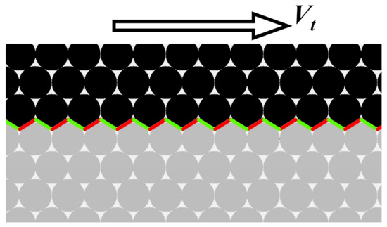 The above-said confirms the relevance of the revealing of “control parameters” that determine the direction of propagation of the elastic vortex (angle α) and the threshold value of the initiating tangential velocity Vcrit of the surface. The dependences α(Vt) and Vcrit(σn) are related to the roughness of both the counterbody surface and the surface of the sample. In the study, both surfaces are one-scale, equal and regularly rough (Figure 11). The surface roughness parameters, in this case, are determined by the size of the movable cellular automaton d. The dynamic motion of the counterbody along the contact plane (at the velocity Vt) is accompanied by a local increase in the contact pressure in the “frontal” parts of asperities (the corresponding contact areas of asperities are marked with red segments in Figure 11). At the same time, the contact area and the contact pressure in the “back” areas of asperity contact (marked by green segments in Figure 11) are reduced. This is accompanied by elastic perturbation in the area of contact interaction and the formation of a vortex-like dynamic structure in the adjacent surface region of the solid.