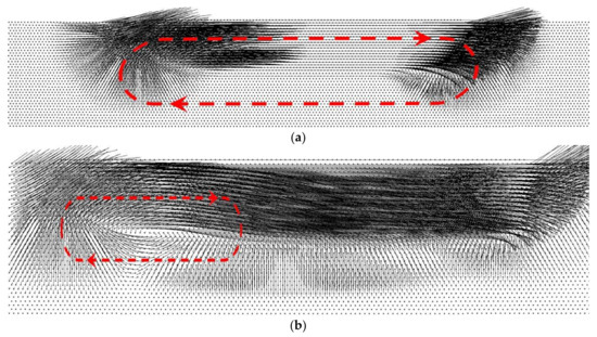 At low contact velocities (Vt < Vcrit), the sample surface has time to adjust to the loading. This is accompanied by the formation of an elongated vortex under the contact area. The length of a vortex is close to the length of the contact zone (Figure 12a). Such a vortex propagates toward the interior of the sample along the normal to the surface (α ≈ 0). At the same time, at Vt > Vcrit, the “back” regions of the asperities of the counterbody quickly lose the contact with asperities of the sample surface, and the surface layer of the sample does not have time to “smoothly” adapt to the external loading. This results in a complex velocity field in the near-surface layer of the simulated sample and the formation of an elastic vortex in the rear part of the contact area of solids (Figure 12b). Such a vortex is characterized by substantially smaller linear dimensions and propagates toward the interior of the sample at a nonzero angle to the normal to the contact surface.