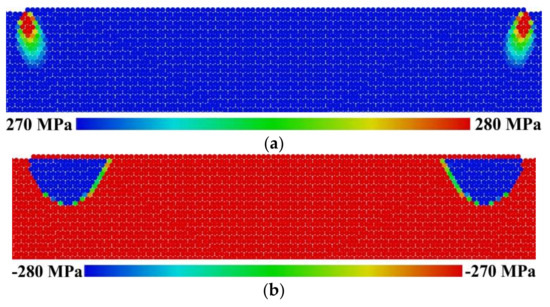 The example of the distribution of equivalent stress (a) and mean stress (b) in the near-contact region of the surface layer distribution at the end of the stage of applying the normal load before the tangential displacement of the counterbody (σn = 1.25σyield). Negative mean stress values correspond to hydrostatic compression.