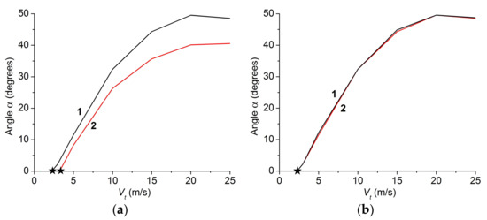 The dependences of the vortex propagation angle α on the velocity of initiating tangential loading Vt: (a) contact areas characterized by Ncont = 100 (Curve 1) and Ncont = 200 (Curve 2); (b) “basic” setup (Curve 1) and ten-times enlarged setup (Curve 2). All results correspond to the same value of contact pressure σn = 0.54σyield. Black stars denote threshold tangential velocities Vcrit.