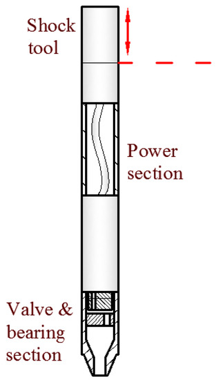 The Hydraulic Oscillation System (HOS) was introduced into the market in 2000 and has been used in thousands of runs globally. The HOS is comprised of two tools: the Drilling Agitator Tool (DAT) and the Shock Tool located directly above [14,15], as shown in Figure 1. The DAT is composed of two sections: the power section and the valve and bearing section. The power section is made up of a positive displacement motor driver. The valve and bearing section is composed of an eccentric orifice, driven by the power section, and matched against a concentric orifice, thus generating a continuous wave of pressure pulse as the rotor turns when the drilled mud is pumped through the system [16]. These pressure pulses travel up into the Shock Tool. The Shock Tool mandrel extends as the pressure increases with each pulse, and the disc spring within the Shock Tool causes its mandrel to retract as the pressure drops between pulses. This cyclical extension of the Shock Tool mandrel creates the axial oscillation motion which spreads through the drill string, both above and below the DAS [17]. The type of axial vibration motion is considered to be sine or cosine [10].