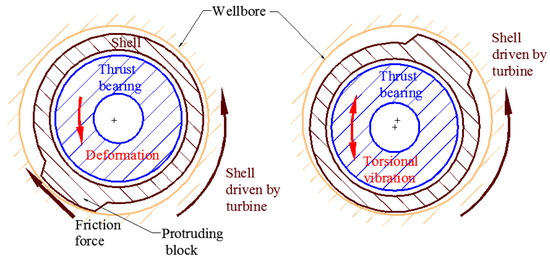 Radial hydraulic oscillation is also an important friction reduction tool [19]. It consists of a shell (1), turbine (2), eccentric shaft (3), and bearing (4) [20], as presented in the Figure 3. Its structure involves an eccentric shaft that is driven by the turbines. The rotating eccentric shaft generates a periodic centrifugal force in the vertical direction. The centrifugal force could affect the normal force between the tool and wellbore. It influences the axial friction force of the drilling string. The centrifugal pattern should be sine or cosine according to the working structure of radial hydraulic oscillation.