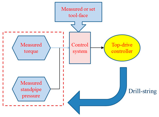 The maintain of the tool-face of the bottom hole assembly was treated as one of the control objectives. The surface torque and stand pipe pressure values were treated as feedback of the Slider Drilling Technology, as presented in the Figure 4. This technology deploys a control system with the top drive controller that automatically rocks the pipes to the right and left. The motion of the drill string was subjected to a rigorous analysis of torque by a computer/software [21,22,23], as it could affect the actual surface torque and standpipe pressure.