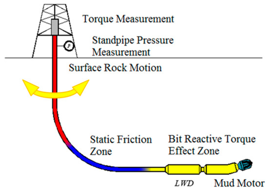 The system works by rotating the top of the drill string, so the upper part of the drill string always experiences tangential motion. The system maintains the drill string friction in the dynamics mode and significantly reduces axial friction [13,23]. However, in the slide drilling mode, it needs to maintain the stability of the tool-face of the steerable mud motor. The rocking motion of the drill string should not affect the bottom hole assembly (BHA). So, there is maximum depth to which a particular applied surface torque can twist the drill string. This depth was determined by a typical torque and drag program [21,24,25]. The actual maximum depth was influenced by the surface maximum clockwise and counterclockwise torque [26]. It was found that the reactive torque of the mud motor was counteracted by the friction of the BHA, as presented in the Figure 5. The friction could keep the tool-face stable. Therefore, there were three zones of the drill string in the slide drilling mode: the surface torque effect zone, the static friction zone, and the bit reactive torque effect zone.