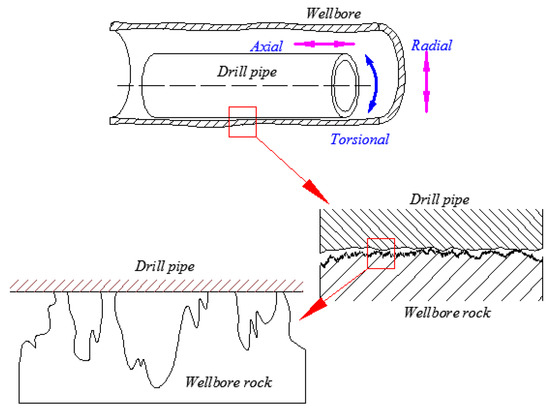 To analyze the real working conditions of a drill string in a down-hole, the following assumptions were made: (1) the asperities on the drill string were rigid; (2) the asperities on the wellbore rock were elastic; (3) rolling of the drill string would not occur.