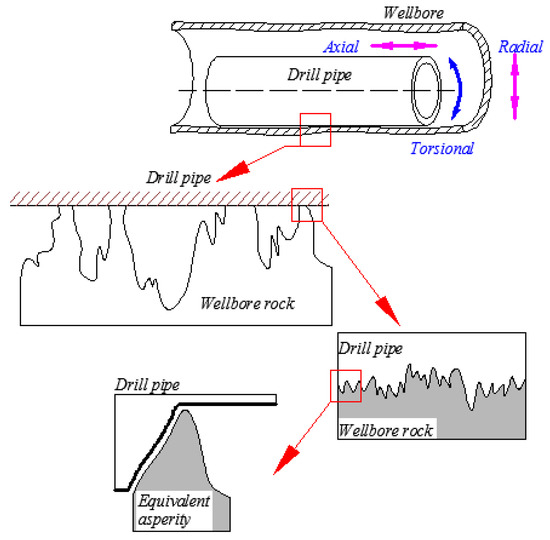 The rough wellbore rock can be simplified as peaks that come into contact with the surface of the drill string. This occurred on the millimeter-scale. The contact area between peaks and the drill string consisted of many asperities. The friction behavior of these asperities is equivalent to that of one asperity, as presented in Figure 7. The equivalent asperity usually occurred on the micrometer-scale.