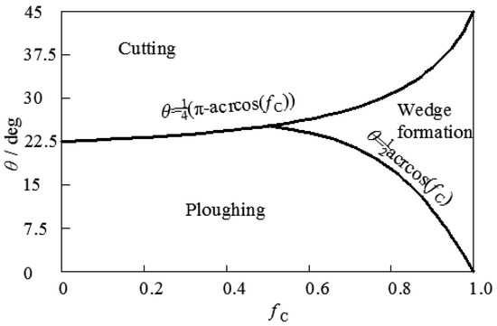 Friction forces acting on individual asperities were described by adopting the contact model of Challen and Oxley [31,32]. This model deduced two-dimensional (2D) slip-line fields, assuming a plane strain deformation state and ideal plastic material behavior. The active model could be determined by so-called wear-model diagrams, as presented in Figure 8. These diagrams describe friction modes as a function of the attack angle of the wedge-shaped asperity θ and the shear factor fC.