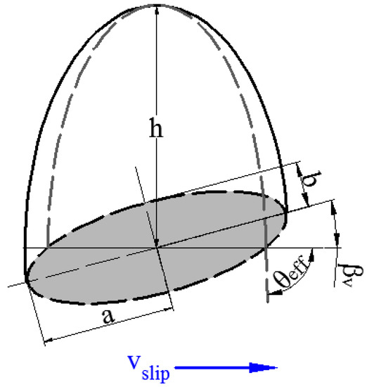 An asperity can be simplified as an ellipsoid, as presented in Figure 9. The angle between the orientation of the ellipse and the slip direction is θ. The effective attack angle θeff between the elliptical paraboloid and the counter surface is defined as [35]: