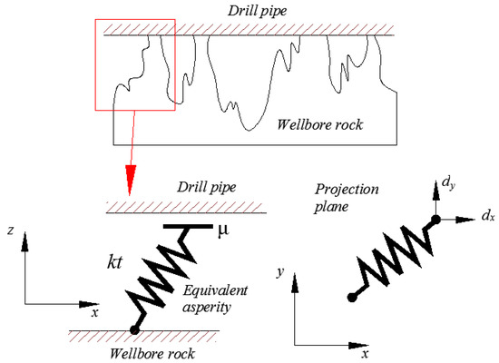 In the model used for further analysis, the deformation in the contact zone formed by the contact of general asperities sliding and the rotary drill string was modeled by a generalized elastic artificial element, which described the average behavior of the general asperities (Figure 10).