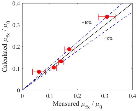 Particle Swarm Optimization (PSO) was adopted to identify the parameters of the established model. The adaptive function of PSO revealed a negative difference between the calculated and the measured values. The results of the parameters identification are listed as follows: kt was 42.7 (N/mm), a was 10.45 μm, b was 15.65 μm, and h was 5.09 μm. An analysis of the results is presented in Figure 13 and Figure 14. The errors between the model prediction and experimental measurements were less than 10%. The established model could effectively describe the friction between metal and rock, as presented in the Figure 13 and Figure 14.