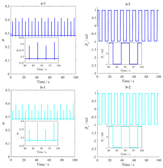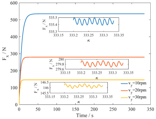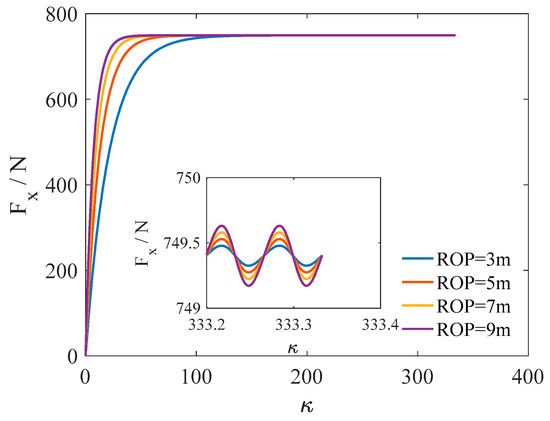 According to the simulation results, Figure 24 presents the friction coefficient and angle between the drill string motion direction and the principal axis of asperity with different ROPs. The maximum angle of the rocking motion was 30 rad. The difference between these angles was not obvious. The direction of the asperity deformation was stable when the tangential velocity was constant. The difference between these angles was not obvious, which was attributed to the asperity deformation. This implied that the asperity deformation reduced the change of the angle between the drill string motion direction and the principal axis of asperity. However, the friction coefficients were slightly different from the distinct ROPs when the rotation direction was shifted. The greater tangential velocity resulted in larger axial friction coefficients.