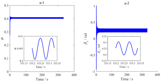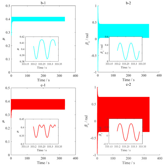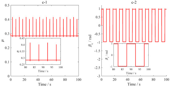 (a-1, b-1, c-1) Friction coefficient; (a-2, b-2, c-2) angle between the drill string motion direction and the principal axis of asperity. (a-1, a-2) ROP = 3 m/h; (b-1, b-2) ROP = 5 m/h; (c-1, c-2) ROP = 7 m/h.