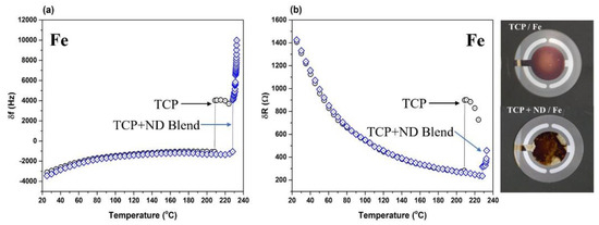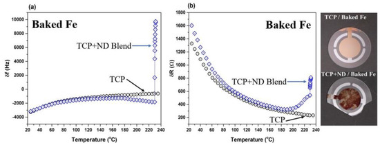 The f and R responses of QCMs with baked Fe surfaces are shown in Figure 3a,b, respectively. The QCM responses for baked Fe in the absence of nanodiamonds exhibited a similar trend for the liquid loading with variations in f and R with temperature associated with the temperature dependent viscosity and density of the oil. No characteristic feature was observed in the absence of nanodiamonds: As we have previously reported, thermal reaction films do not readily form on the thick oxide layer formed by baking the Fe sample in air. However, in the presence of nanodiamonds, the feature associated with the formation of a TCP thermal reaction film was observed at 228 °C. Changes in frequency and motional resistance were also observed in the presence of nanodiamonds, starting at around 190 °C. The optical images of the QCM for the absence of nanodiamonds showed some discoloration but no film on the surface, while for the presence of nanodiamonds, the film appeared visually similar to that on the Fe surface, as shown in Figure 2.