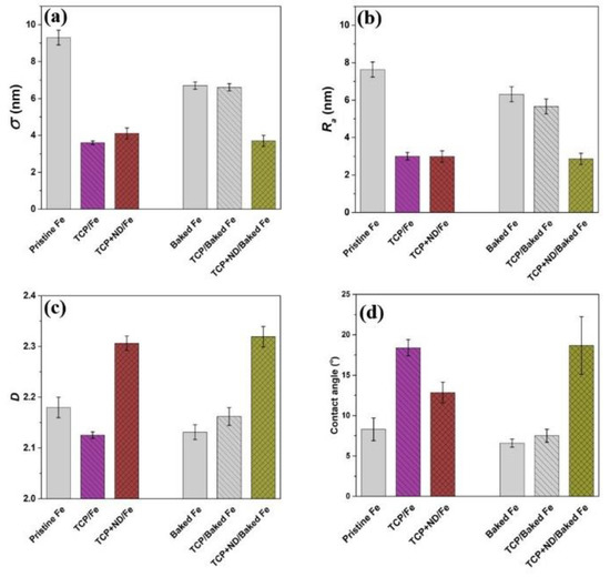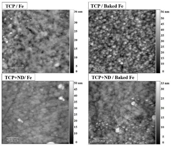Figure 4 shows the Fe and baked Fe surfaces after the TCP uptake in the absence and presence of nanodiamonds. The baked Fe surface without the nanodiamonds showed no film on it, and the surface appeared similar to that before the TCP uptake (see reference [19]). The other three film forming surfaces showed similar morphologies. The films formed in the presence of nanodiamonds were expected to show the presence of nanodiamonds on their surfaces; however, we could not confirm this from the AFM measurements on these films. It is plausible that the nanodiamonds were not present on the top of the film to interact with the AFM probe. The values of σ, Ra, D, and the contact angles between the base oil and the various surfaces are shown in Figure 5. The thermal reaction films for the three film forming systems were observed to have similar roughnesses (σ or Ra) with values smaller than those of the corresponding surfaces before the film formation. The values of D for the thermal reaction films formed in the presence of nanodiamonds were significantly higher, implying a slightly more jagged surface texure for these films relative to the others. Despite a significant change in texture, the presence of nanodiamonds in the oil did not increase the magnitude of either σ or Ra for the films, and, as will be described in a later section, the nanodiamonds were not observed to be protruding above the top of the films. The contact angle for the thermal film formed on the Fe surface was slightly lower when nanodiamonds were present which is potentially beneficial. No such comparison could be made for the thermal films formed on the baked Fe substrates, since the films did not form on them in the absence of ND.