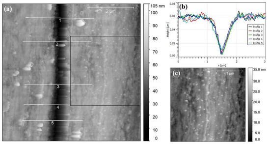 We measured the film thickness ex-situ by etching through the thermal reaction films with a pin dipped in oxalic acid and then measuring their thicknesses at the film–surface boundaries with AFM. Oxalic acid is particularly effective for such measurements as it has minimal impact on the Fe substrate underneath the film. We have previously reported that the thickness of the thermal reaction film on Fe surface in the absence of nanodiamonds can be observed in the range of 60–80 nm, and during the measurement, we noted that the thermal reaction films on Fe surfaces were readily removed from the surfaces with oxalic acid [19]. However, a similar protocol was not applicable for the thermal reaction films formed on Fe surfaces in the presence of nanodiamonds, because these films were relatively stronger. The acid etching could only remove the top layer from this relatively stiffer film, so an additional mechanical force from the pin was required to remove the film completely. Figure 6 shows the groove formed on the thermal reaction film by the pin. On either side of the groove, the top layer from the thermal reaction film was etched away which fortuitously uncovered the nanodiamonds embedded into the film. The expanded view of the selected section of thermal reaction film revealed many small, circular protrusions with diameters in the range of 20–50 nm and heights of up to 20 nm (ibw format file of the AFM image is available in the Supplementary Material). These were the nanodiamonds that were embedded into the thermal reaction film formed in the presence of nanodiamonds. Since these nanodiamonds partially protruded out of the etched film, it was estimated that, at minimum, a 20 nm thick top layer film must have been etched away. The measured height profiles across the groove showed that the depth of the groove was in the range of 45–60 nm. Therefore, the total thickness of the thermal reaction film ranged from 65 to 80 nm. This film thickness for the thermal reaction film formed on Fe surfaces in the presence of nanodiamonds was same as the thickness of the film formed in the absence of nanodiamonds. This revealed that the thickness and the average rate of formation of the thermal reaction film (estimated to be about 2.3 nm/min [19]) was unaffected by the presence of nanodiamonds, though the nanodiamonds were found to be embedded into the film, making the film stiffer, as gauged by the QCM response data. The estimated quantity of nanodiamonds in the film, based on Figure 6c, was 9.7 × 1019 particles/m3, which is about five times higher than the concentration of 1.8 × 1019 particles/m3 in the original solution. This is not unexpected given that the total volume of the TCP + ND blend used in the experiments was about 5 mL, and the distribution of nanodiamonds in the film was inhomogeneous which may have resulted in the five-fold increase in concentration of some sections within the film.