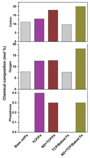 The chemical compositions of the Fe and baked Fe surfaces heated in base oil or in 5% TCP in base oil in the presence and absence of nanodiamonds obtained by the EDS are shown in Table 1. We note that the Cr metal used as an adhesive layer between the quartz disc and the Fe sensing electrodes was also present in the EDS measurements as well as silicon attributable to the quartz substrates. This is to be expected, given the penetration depth of the 20 kV accelerating voltage employed for the measurements. Figure 7 is a graphical representation of the selective elements (P, O and C) from Table 1. The thermal reaction films formed on the Fe (with and without nanodiamonds) and baked Fe (with nanodiamonds) revealed the presence of phosphorus, whereas the surfaces with no reaction films had no phosphorus content. The TCP thermal reaction films have been reported in prior literature [3,19,26] to comprise inorganic phosphates, consistent with the increase in P and O content but not the significant increase in C content. With the presence of nanodiamonds, the thermal reaction films on both the Fe and baked Fe surfaces had significantly higher levels of C compared to films without nanodiamonds. This increase in C is attributed to the nanodiamonds being embedded into the thermal reaction films. The O content of the film formed on the baked Fe surfaces weres much higher than the films formed on the Fe surfaces. This is consistent with the fact that the formation of the thermal reaction film on the baked Fe surfaces in the presence of nanodiamonds followed a different mechanism path, as discussed later in the discussion section.