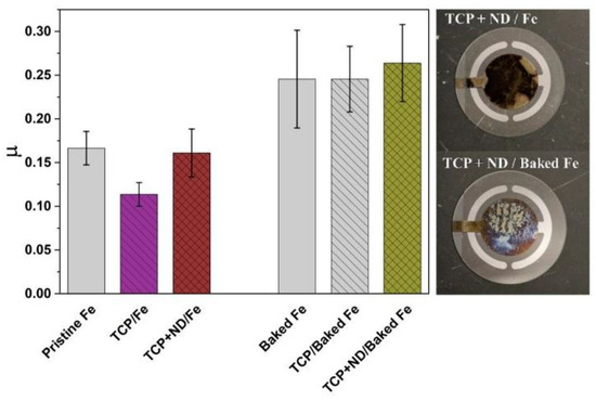 The coefficients of sliding friction measured during dry solid–solid contact between surfaces of various QCM samples and stainless-steel balls. The QCM images (on the right-hand-side) after the friction measurements showing the conditions of the thermal reaction films on the Fe and baked Fe surfaces formed in the presence of nanodiamonds are shown.