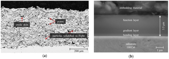 The pin material for tribological experiments was chosen to represent a DLC coated piston ring while the disk material has been selected to represent a modern cylinder liner surface of a combustion engine. The plasma thermal wire arc (PTWA) spray coating (Terolab Surface GmbH, Langenfeld, Germany) applied to grey cast iron (EN-GJL-250) was deposited from a low-carbon steel (EN 10016-2) and had a thickness of up to 500 μm after deposition. The coating showed typical microscopically large inhomogeneities, characterized by pores, oxides and particles that had already solidified in flight. Figure 1 shows a cross section of the coating and the DLC layer.