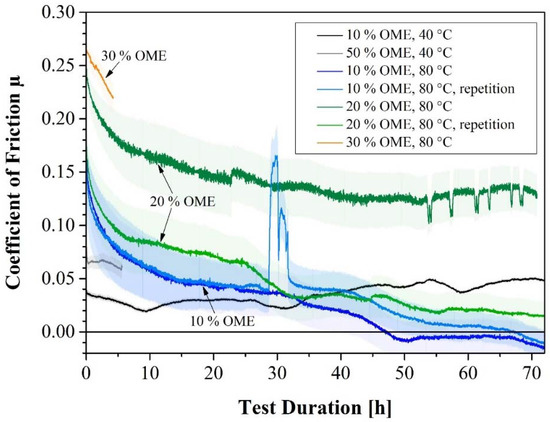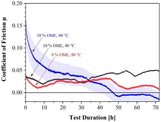Within the first 10 h of the OME tests at 80 °C, a rapid decrease in the coefficient of friction can be observed, which can also be explained by the evaporation of the OME and the higher load-bearing capacity of the lubricant. The friction coefficients in the negative are artifacts and were caused by zero point shifts of the force sensor. The absolute value of the shift is low but can affect the coefficient of friction in the hydrodynamic regime.