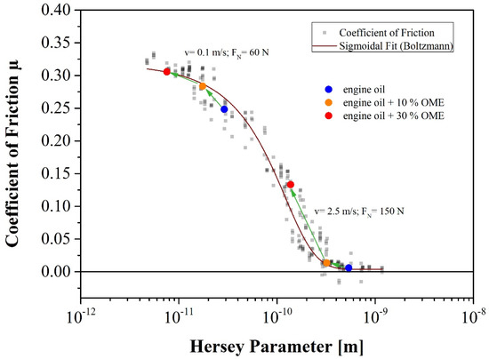 The addition of OME to the lubricating oil generally reduces viscosity. Friction partners can thus be separated less effectively from each other and the formation of a load-bearing lubricating film can be prevented. From a content of 30% OME (80 °C), no hydrodynamic conditions are achieved under the predefined test conditions. Operating points with very low coefficients of friction (e.g., at 2.5 m/s, 150 N) are already shifted at 10% OME into the mixed friction regime with a growing proportion of solid state friction. This trend is further intensified with increasing OME concentration, as can be seen in Figure 5, where all friction data is plotted over the Hersey-number H = ηv/p, where η denotes the viscosity, v is the entrainment speed, and p the normal load. The Hersey number is related the oil film thickness and indicates the lubrication regime.