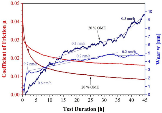 In the tests with engine oil and engine oil plus 20% OME, the wear rates were below 1 nm/h. Due to the lower load-bearing capacity of the lubricating film of the oil thinned with 20% OME, higher contact pressures initially prevailed in the tribological system, which explain the higher beginning of the coefficient of friction.