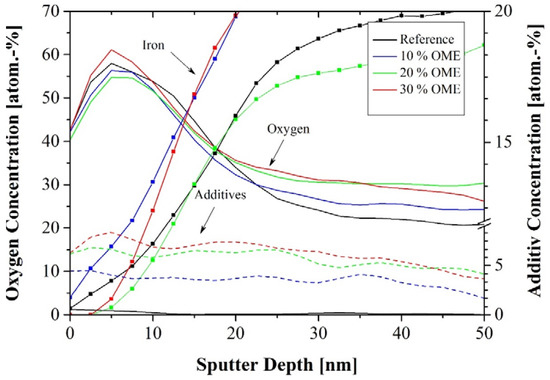 Furthermore, a correlation between the oxygen concentration and the concentration of the additives at a depth of more than 30 nm is found. As the OME concentration increases, oxides of the additives, namely Ca, Zn and P, are increasingly detected, which also led to an increase in the oxygen concentration at greater sputter depths.