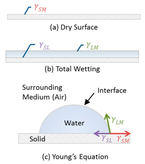 When , and fluid is drawn to the surface to increase the wettability of the surface. When , and fluid beads up on the surface because fluid molecules are drawn more strongly to each other. In Equations (3)–(6), the spreading parameter (), adhesion work (), and cohesion work () can be evaluated with knowledge of the surface tension between the liquid and the surrounding medium () and the contact angle between the liquid and the surface (). Both of these parameters can be attained through optical measurement [15,36,37].