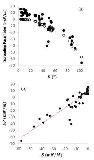 While and are not linear functions of , they appear to be linearly related to each other (Figure 2b). The results presented here showed a strong linear correlation between and with a slope of and a coefficient of determination () value of (Table 2). The uncertainty for the 95% confidence interval of this linear fit is 2.7 . It is unclear how uncertainty in the linear regression compares to experimental uncertainty in the spreading parameters, as this information is not reported in references [6,9,15]. Nevertheless, this data suggests that wettability is similarly described by and . This was not unexpected as is derived from (Equations (4)–(9)).