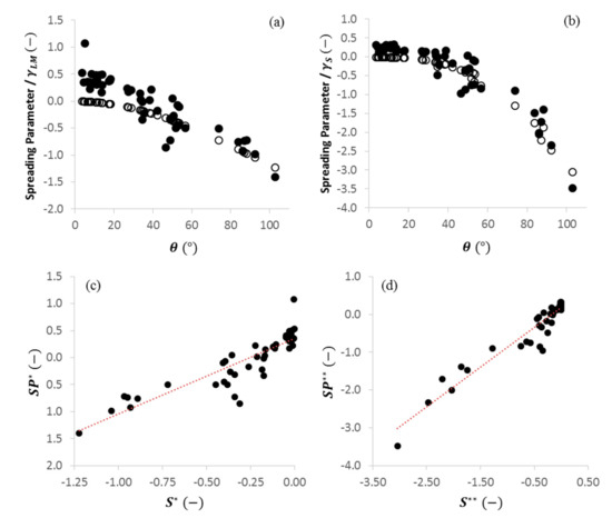 The spreading parameter can be described as a function of the contact angle by introducing Young’s equation. Young’s equation is a vector sum of the three components of surface tension at the contact line (Figure 1c) such that