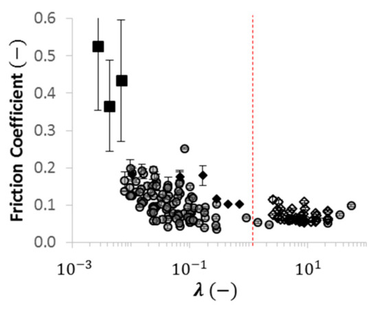 Friction coefficients were low and relatively consistent as increased above approximately . This was observed for the complete dataset (Figure 6) and when data for neat ILs and MR fluids was separated (Figure 7). This is consistent with the hydrodynamic regime where the lubricating film reduces friction by preventing asperity contact, but viscous effects increase the friction coefficient as the film thickness increases. Subtle differences in the literature regarding the definition of the beginning of the hydrodynamic regime (λ greater than to ) may be related to the role of wettability in this regime.