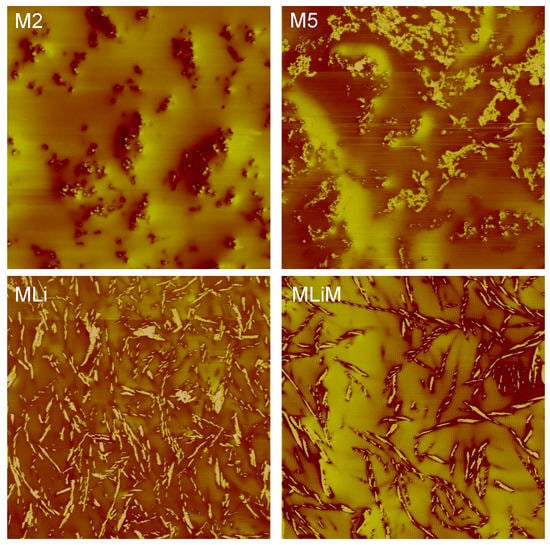 The resulting 2D images (5 m × 5 m) of the topography of greases M2, M5, MLi, and MLiM are shown in Figure 1. At least two pictures were taken in different areas of the same sample to ensure that each picture was representative of the sample’s surface. For each measurement, the system scanned the surface in two different directions, but only the one that showed the smaller amount of artefacts is presented here.