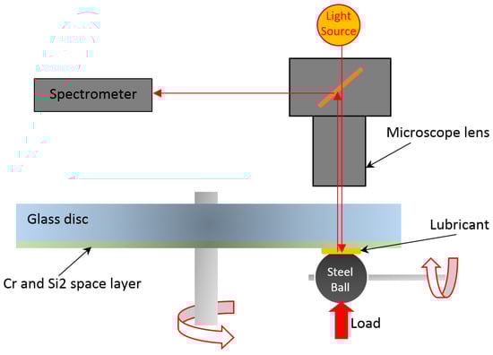 To evaluate the lubricant film thickness in a ball-on-disc contact, the interferometry technique was used. Produced by PCS Instruments (UK), the EHD2 device is capable of measuring the lubricant film thickness in a ball-on-disc or roller-on-disc configuration for thin films (1 nm resolution up to 1000 nm). This device is capable of controlling the lubricant temperature, ball and disc entrainment speeds, contact load, and slide-to-roll ratio (SRR).
